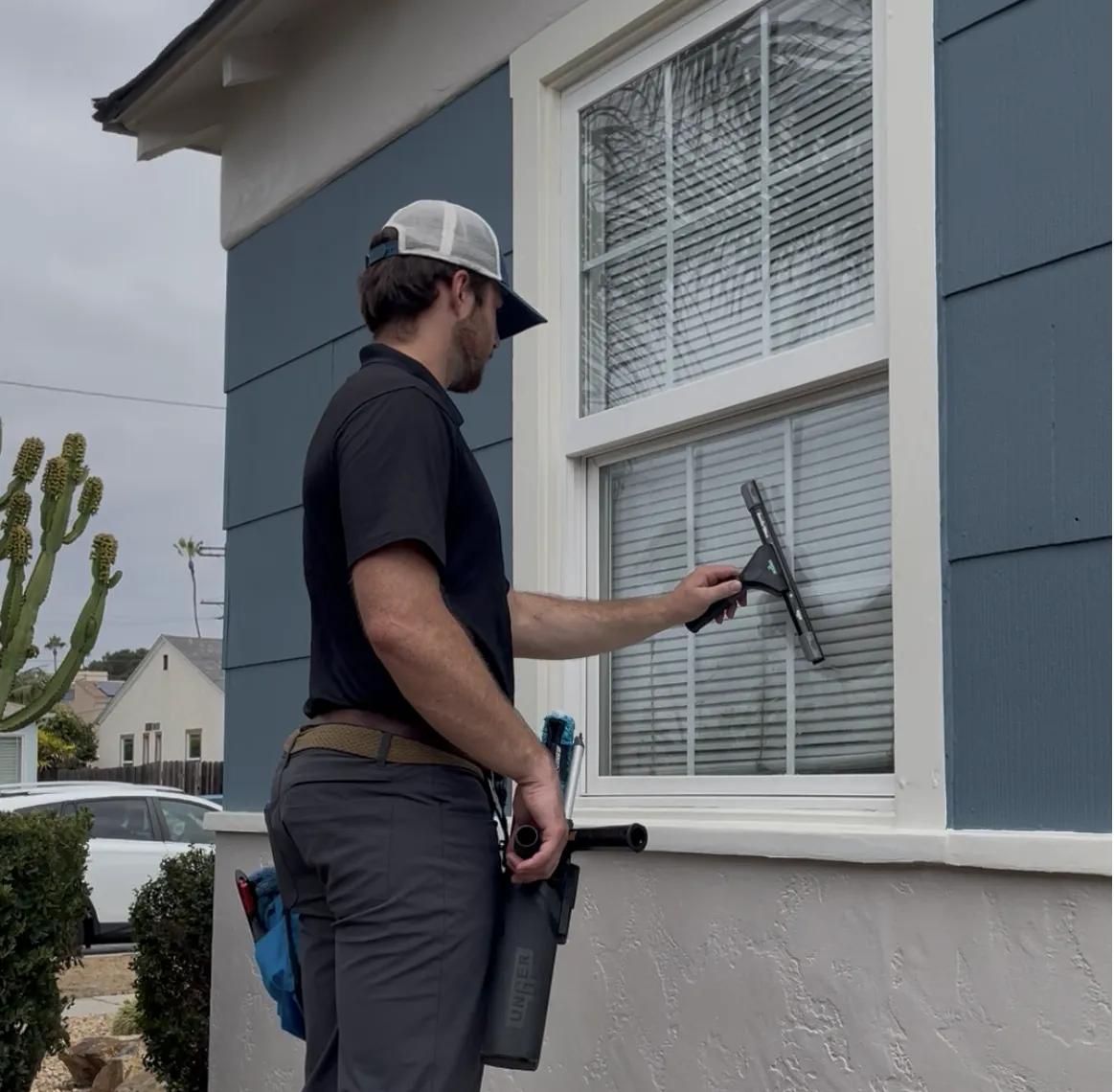 Professional mop & squeegee, light wipe of frames/sills, loose debris removal on glass, and a quick dust-off and spray of removable screens. Deep screen wash or track detailing are optional add-ons.